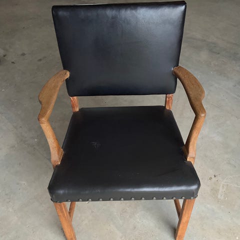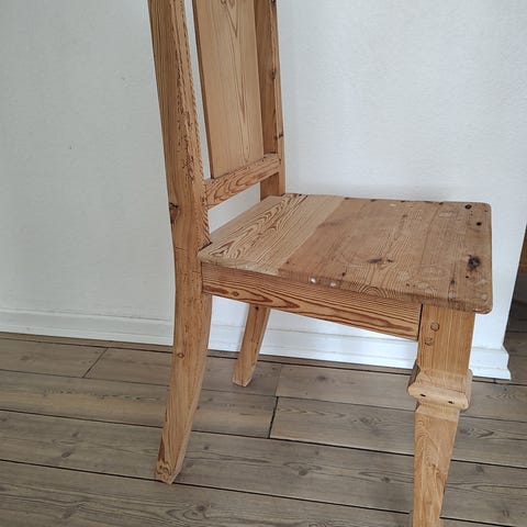 Stol i fyrretræ fra Nørskovlund skole, brugt på inspektørens kontor.