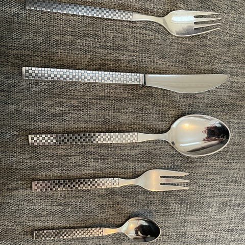 Bestik sæt med serveringsdele i sølvfarvet metal. Sættet omfatter forskellige dele som serveringsskeer, sauceske, kagespade, lille ske og stegegaffel. Håndtagene har dekoreret mønster ved overgangen til skaftet. Egnet til servering ved borddækning og brug i køkkenet.