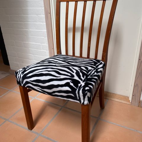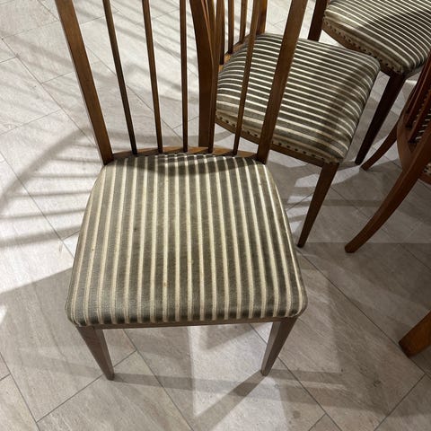 sæde og ryg betrukket med møbelstof, slid i varierende mængder på stof.