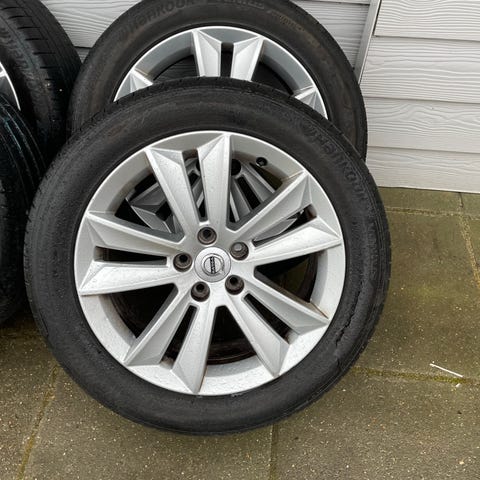 Continental sommerdæk med fælge. Sættet består af fire dæk monteret på alufælge med 5 bolthuller, med tilhørene stativ til opbevaring. Dækkene er fra Continental, og fælgene er sølvfarvede med multieget design. Velegnet som komplet hjulsæt til personbil. Har siddet på en Mazda 5-CX og brugt 2 sæsoner