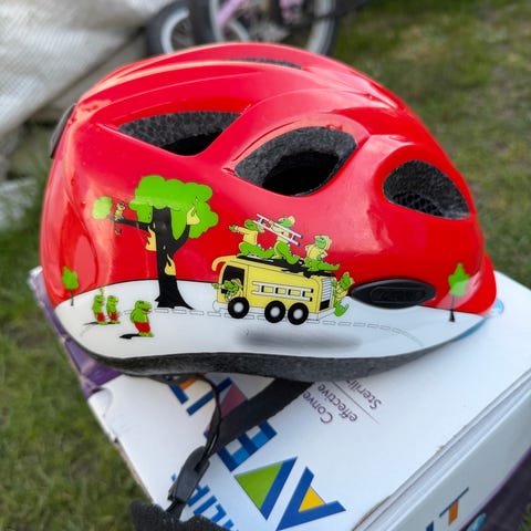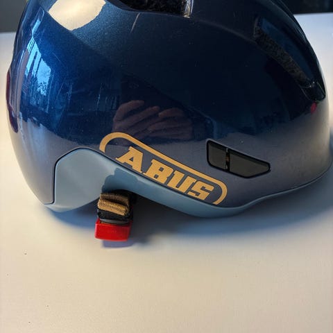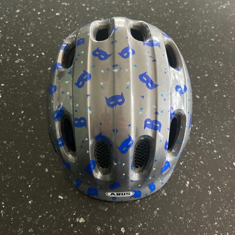 Abus cykelhjelm i blå og gulgrøn farve til børn størrelse 48-55. Justerbare stropper under hagen. Fejler intet.