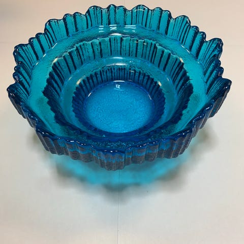 Skålen har bølget kant og dekorativt mønster i glasset, som giver et fint spil i lyset. Perfekt som frugtskål, til servering eller som pynt.