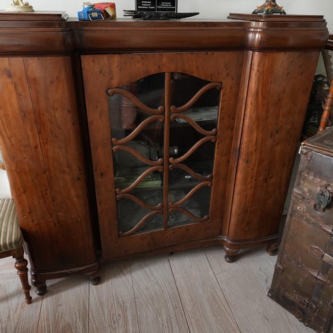 162cm højt - 94cm bredt ( ståfladen en ligebenet retvinklet trekant med hypotonuse - ydre med mahoniefiner på fyrretræ, hylderne er også af fyr -94cm & kattedre 67cm) -for oven en skuffe 14cm dyb - nøgle til dør og skuffe medfølger, begge nøgleskilte af perlemor er i fin stand - Skabet er fra ca. 1885 - objektivt i udmærket stand ikke bare i betragtning af alder. - Kan ikke sendes -> må afhentes på adresse i Helsingør kom.