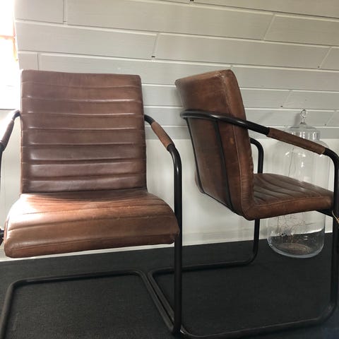 Med stel af sortlakeret stål. Armlæn af sort kernelæder og betrukket med ponyskind.