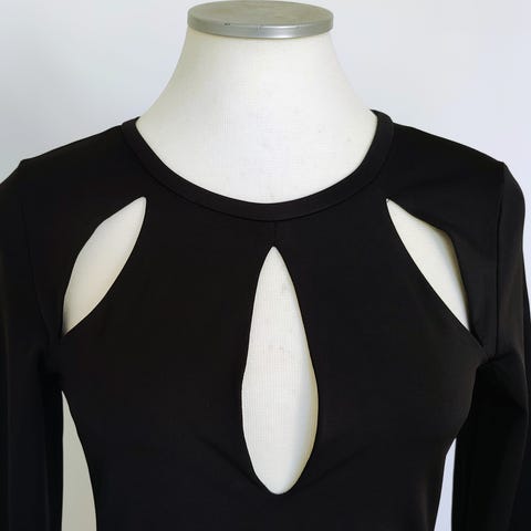 Smuk kort dametop fra QUELLE. Toppen er i bomuld og har dyb V-udskæring foran samt knudedetalje i midten. Modellen har 3/4-ærmer og åbne sider under knuden, hvilket giver en cropped pasform. Velegnet som overdel til højtaljede underdele eller som lag-på-lag over kjoler eller toppe.