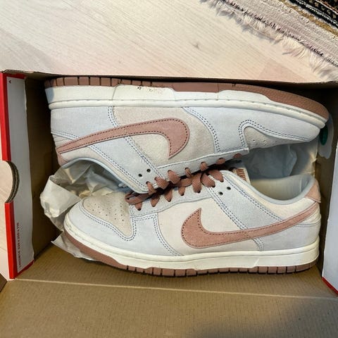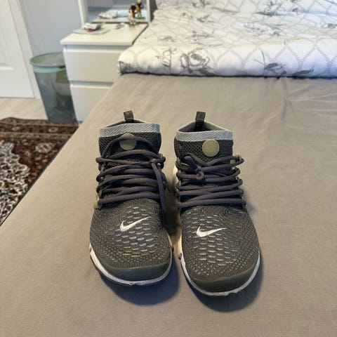 Nike sneakers i str. 42. Modellen er i grå og hvid med mørkeblå Nike-logoer. Overdelen er i en kombination af glat materiale og perforeret snude for ventilation. Skoene har snørelukning, polstret kant og indersål med Nike-logo. Ydersålen er flad og mønstret for bedre greb. Velegnet som hverdagssko og fritidssko.