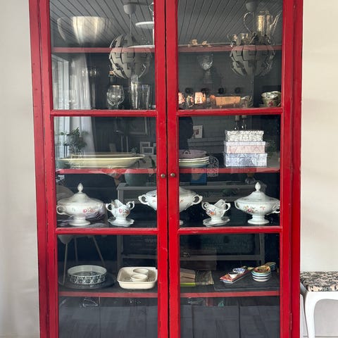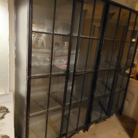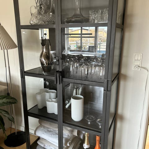 Flot vitrineskab står som da vi købte det for 3 år siden for 6000 kr. ( fåes stadig til samme pris) målene er: 175 høj, bredde 80, dybde 35 cm. Det er meget tungt ca 75 kg så der skal to mand til at bære det ned fra 2. Sal