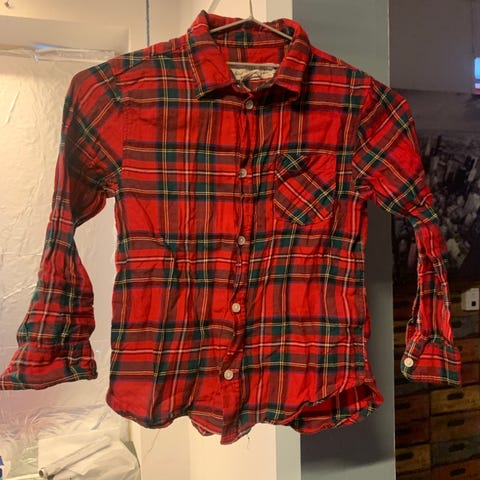 Ukendt mærke skjorte til dreng i str. 116. Lille i størrelsen . Skjorten er i multifarvet mønstret bomuld med lange ærmer og knaplukning foran. Den har brystlomme med knap og afrundet kant forneden. Velegnet som hverdags- eller pæntøj over T-shirt eller alene.