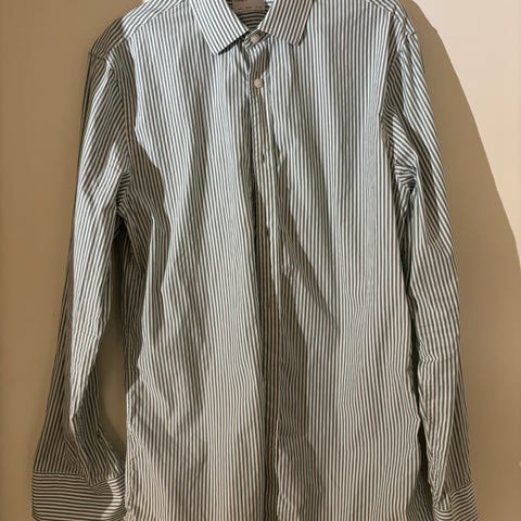 Hvid skjorte med blå striber fra Barons. Skjorten er brugt få gange og er i rigtig god stand. Det er størrelse medium slim fit.