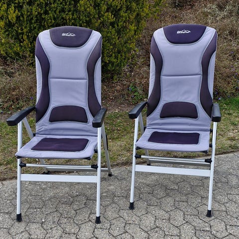 Camp Forever campingstol i sammenklappeligt design. Stolen har gråt stofsæde og -ryg med diskret mønster samt armlæn. Stel i metal med let konstruktion, egnet til brug ved camping, terrasse eller altan. Ryggen er høj og giver støtte til nakke og ryg. 5 stk haves - 150 pr stk