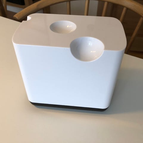 Design: Sættet består af en rustfri stålbase med en skærearm og en matsort kubusformet boks med fordybninger til opbevaring i køleskabet.