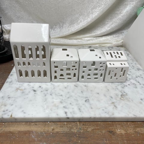 Kähler Urbania fyrfadsstager formet som huse i hvid keramik. Stagerne har udskårne vinduer og døre, der lader lyset skinne igennem. Egnede til fyrfadslys og som dekorative elementer i hjemmet, fx på bord, hylde eller vindueskarm. På undersiden fremgår Kähler-logo og årstal på den ene stage.