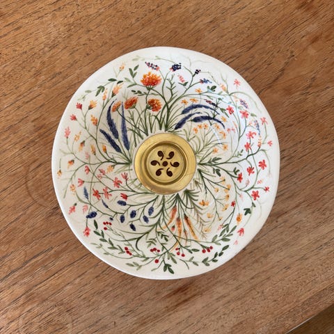 Vi sælger en ældre væghængt håndvask i porcelæn med masser af patina og karakter.