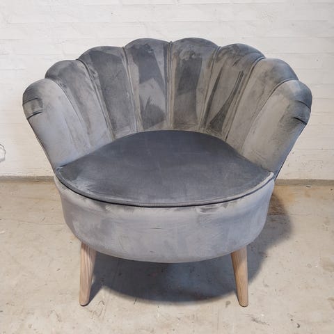 Cosy Living i grå velour stol med mørke træ ben. Fast polstret. God til teenage værelse evt til make up bordet. Afslag på det ene ben. Højde 75 cm bredde 50 cm sæde dybde 44 cm sæde højde 45 cm