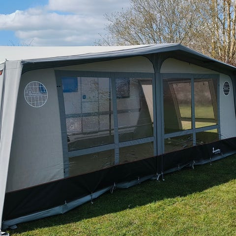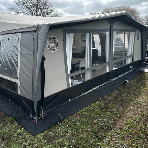 Teltet fulgte med i købet af en let brugt campingvogn, men vi kommer ikke til at bruge det og har ikke haft det slået op. Det er kun brugt meget lidt og ser stort set ud som nyt.
