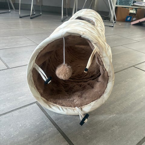 Kattetunnel i beige og hvidt mønster med blød plysbetrukket inderside. Tunnelen har rund åbning på siden samt snor med plysbold indvendigt. Den kan foldes sammen og spændes fast med spænde for nem opbevaring. Velegnet som legetunnel og hyggeplads til katte eller små kæledyr indendørs.den måler 85 cm lang og 25 cm i dia . Den er helt ny , aldrig brugt ( jeg kan sende )