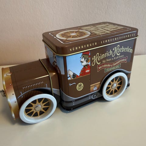 Bilen er lavet af metal og beklædt med rødt velour. Det er en spilledåse som starter og spiller “Helan går”, hvis den er trukket op, når man løfter flasken.