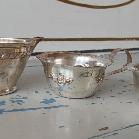 Sukker & Fløde i norsk tin . hanken på flødekanden er desværre gået fra ved lodningen , kan nemt repareres med en loddekolbe ellers er de i rigtig fin stand. Ses på foto og på PRIS.