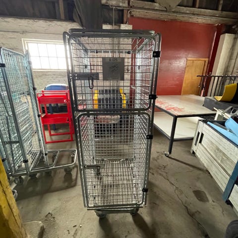 Stort rullebur i kraftig metal med låge og hjul. Velegnet til lager, butik eller transport af varer.