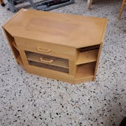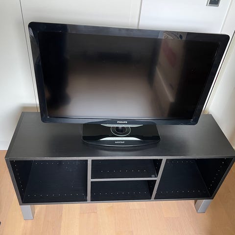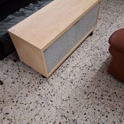 Tvbænk i betonlook med to hylder og en låge hul til ledning