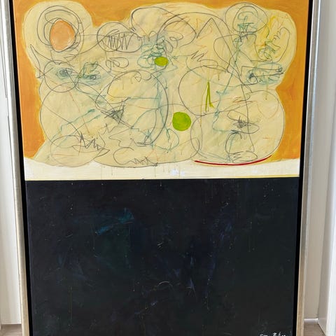 Abstrakt maleri med store, dynamiske penselstrøg i stærke farver som gul, rød, grøn, blå og brun. Motivet er non-figurativt og sammensat af overlappende farvefelter og bevægelige former. Billedet er rektangulært og indrammet med en lys, enkel ramme, som giver et neutralt afgrænsende udtryk omkring værket. Velegnet som vægkunst i stue, kontor eller andre opholdsrum, hvor der ønskes et farverigt og ekspressivt udtryk i indretningen.
