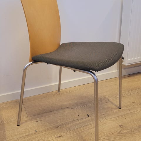 Grå stofstol med ergonomisk form, understel i metal og armstøtter i lyst træ, ideel til både kontor og hjem.- Bemærk at mail, chat og beskeder ikke besvares, og varen skal købes på knappen "Gå til varen". Efter reservering af varen har du 10 dage til at afhente den i den butik, varen er på lager i.