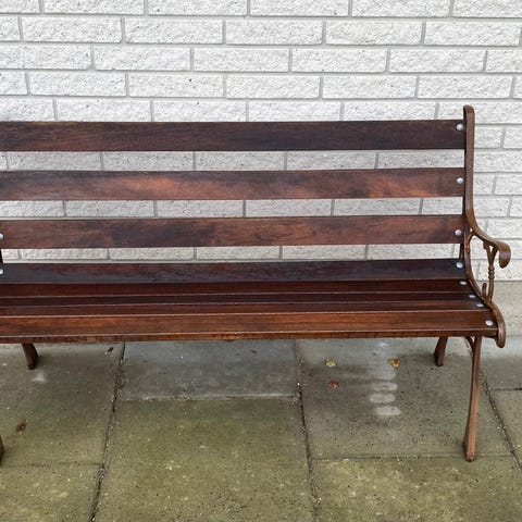 Smuk gammel havebænk i støbejern og træ, fremstår i god stand, dog trænger et enkelt brædde til at blive skiftet, hvis den skal i brug og ikke kun pynte , kan ses i Greve efter aftale.