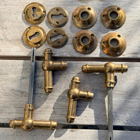 6 stk. dørgreb med tilbehør.