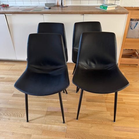 4 spisebordsstole i kunstlæder med ben i lyst træ.