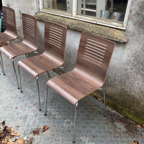 Stolene er stabile og nemme at rengøre. Fremstår i pæn brugt stand med almindelige brugsspor.