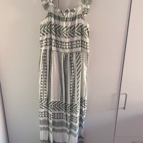 Sommerkjole fra Freequent i størrelse L. Kjolen er lyserød med småblomstret mønster i pink og grønne nuancer. Den er fremstillet i viskose og har trekvartlange ærmer med rynkedetalje ved ærmekanten. Halsudskæringen er rund med lille flæsekant og V-åbning. Skjulte lommer i siderne og flæsekant forneden