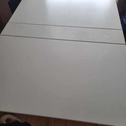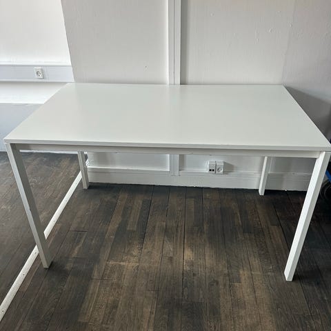 Bord med hvid bordplade i laminat og kantliste i træ.