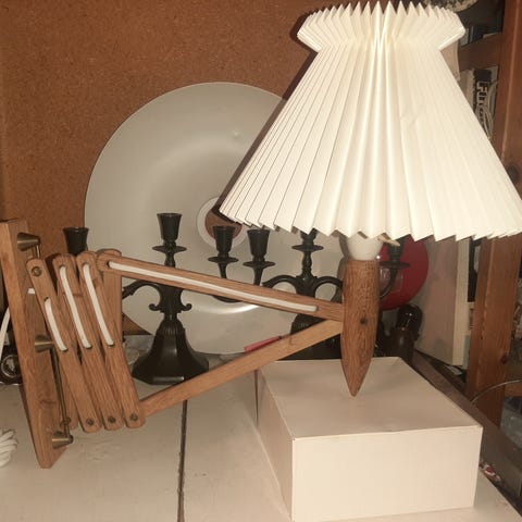 Super flot Le Klint Sakselampe i lys eg. Lille model med rygstykke på ca 30 cm. Lampen er som ny - perfekt stand. Afbryderknap på fatningen. Kan sendes mod at køber betaler forud.