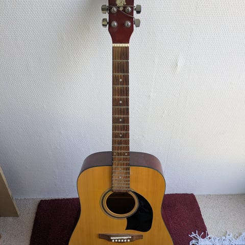 Chord akustisk guitar. Dreadnought-krop med lys naturfarvet top og mørke sider og bagside. Seks-strenget westernmodel med stålstrenge, trægribebræt med dot-inlays og krom stemmeskruer. Velegnet til både øvning og akkompagnement i forskellige musikgenrer.