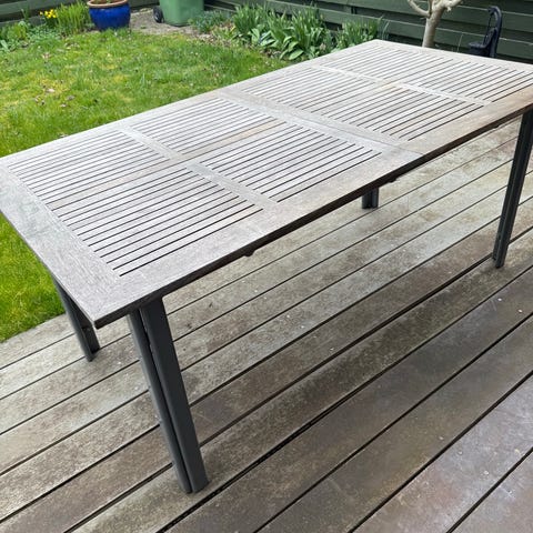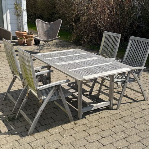 Havebord og stole i teaktræ og metal. Sættet består af et rektangulært bord med bordplade i trælameller og stel i metal samt matchende stole med trælameller i sæde og ryg og metalstel. Egnet til udendørs brug på terrasse eller altan. Designet giver et enkelt og funktionelt udtryk med kombinationen af lyst træ og lyst metal.der er en lameld knækket i den ene stol som nemt kan limes