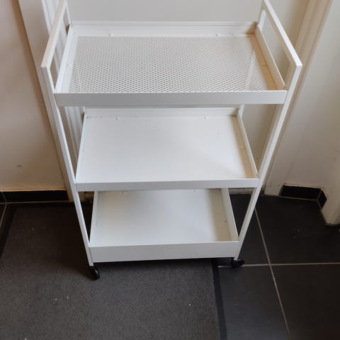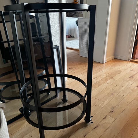 Rullebord med rund glasplade og sort metalstel. Bordet har nederste hylde i glas og står på hjul, hvilket gør det let at flytte rundt. Egnet som sidebord, serveringsbord eller barbord i stue, køkken eller spisestue.