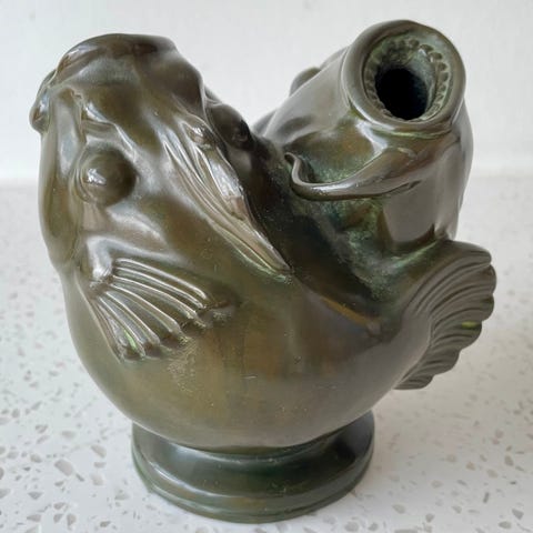 Smuk og dekorativ figur fra Just Andersen med en charmerende bjørn i afslappet position. Klassisk dansk design med flot mørk patina.