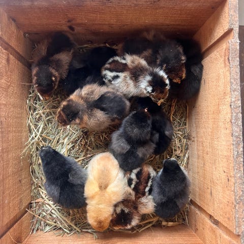 Små kyllinger af blå grønne ægge farver. Vi garanterer at kyllingerne kommer til at lægge æg i de farver som er vist på billedet derfor er prisen 85kr.😊