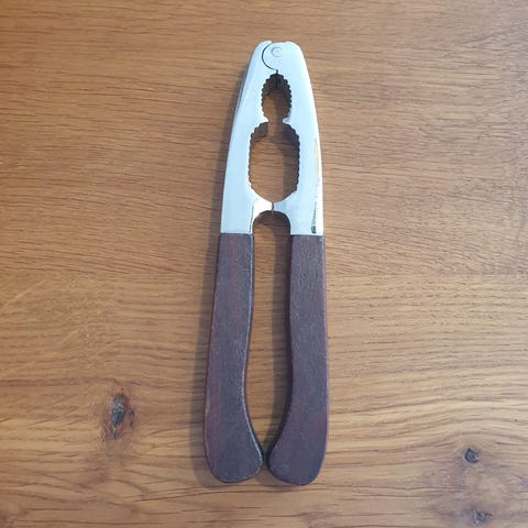 Den gedigne Gefu nøddeknækker er fin som ny og meget let at bruge. Den er 17 cm lang og 5 cm bred. Sælges da vi har to.