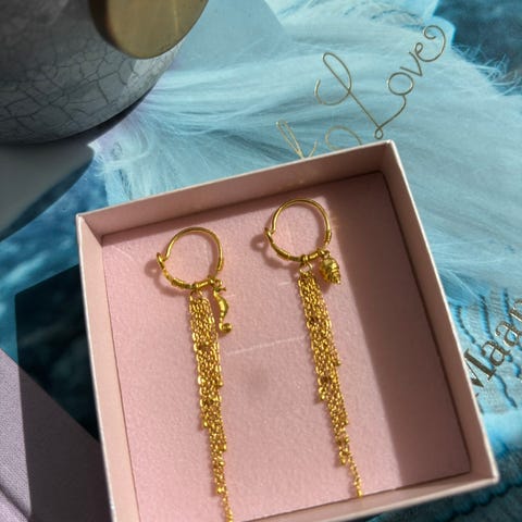 Øreringene er udført i forgyldt materiale og har kædevedhæng samt runde og hjerteformede elementer.