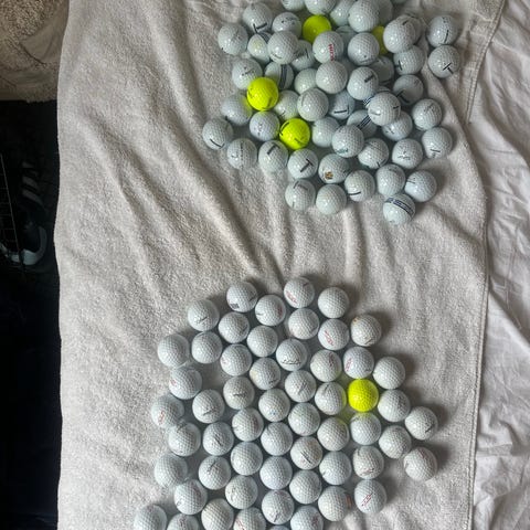 Blandet parti golfbolde fra flere mærker, herunder bl.a. Titleist og Wilson. Ifølge oversigten på billedet omfatter partiet bl.a. Distance‑bolde (48 stk.), Speedsoft (5 stk.), Duo Soft (48 stk.), Velocity (25 stk.) og Distance (5 stk.), i alt ca. 131 bolde.