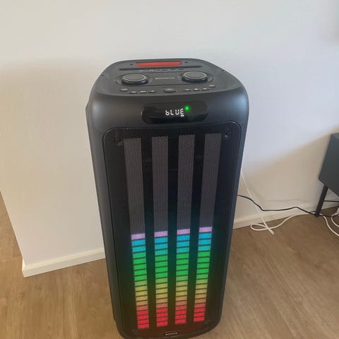 Hi5 boombox højttaler i sort plast med integreret bærehåndtag. Højttaleren har front med indbygget LED-lys i flere farver samt betjeningspanel på toppen med knapper og drejeknap.