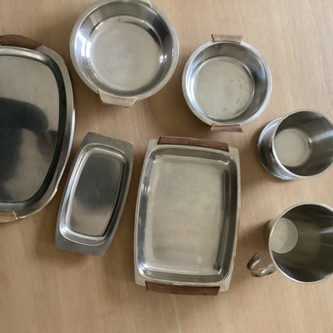 Suppeterrin, 3 stk skåle, 2 stk kander i stål, samlet