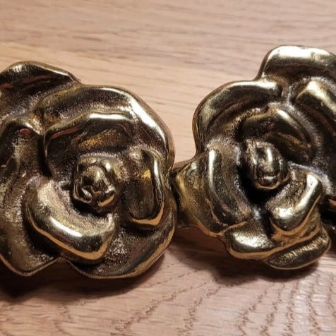 Rigtig gammelt unisex bæltespænde i messing og delt i to dele med detaljeret, messingfarvet ornamentik. Spændet har udskårne mønstre og en dekorativ, bladlignende form. Bagsiden har stænger til fastgørelse på bælte eller elastik. Velegnet til brug på bælter, kjoler, dragter eller kostumer, hvor der ønskes et dekorativt spænde med klassisk udtryk.