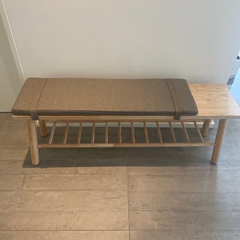 Bloomingville bænk i lyst træ med grå polstret hynde. Velegnet til entré, gang eller andre rum, hvor der er behov for både siddeplads.