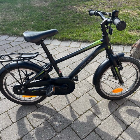 Nishiki børnecykel med 16" hjul i sort med orange detaljer. Cyklen har fastmonteret bagagebærer, kædeskærm, støtteben og reflekser. Egnet som børnecykel til mindre børn, der er klar til at cykle på egen cykel med 16" hjul.