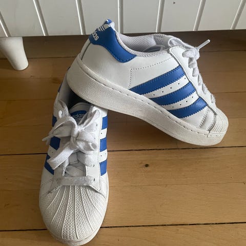Adidas Superstar original sneakers i str. 35 til unisex. Skoene er i sort med hvide striber og gummiskal foran. Klassisk lav model med snørelukning og Adidas-logo på pløs og hæl. Velegnet som hverdagssko til børn i str. 35.