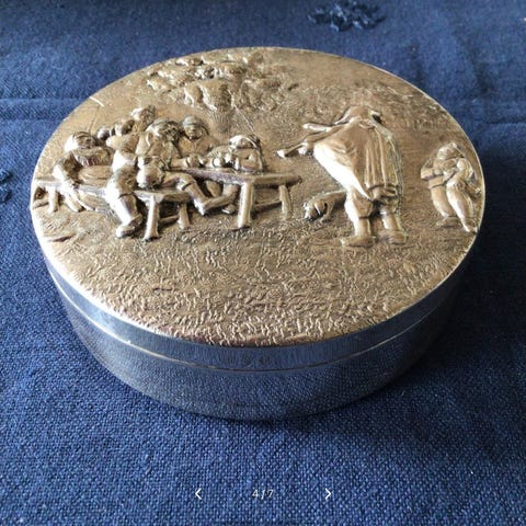 Oval vintage lakæske 17x13x4,5 cm i gyldne og grønlige nuancer. Indvendig sort lak. Egnet til opbevaring af smykker, småting eller som dekoration i hjemmet. Lille repareret afslag i bunden (vist på billede 3) som ikke ses - bortset fra når man vender æsken om.