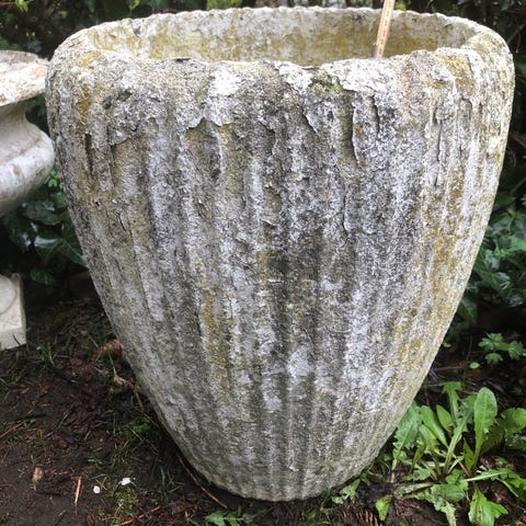 Gammel sandstenskrukke. Højde 40 cm. diameter 45 cm.- Afslag på fod - derfor nedsat pris