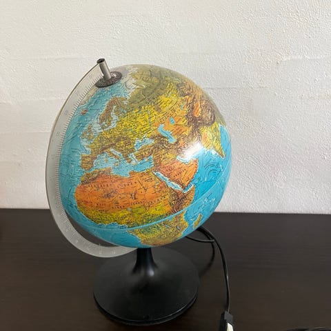 Vintage globus fra 1980 fra det danske firma Scan-Globe. Globussen er i næsten perfekt stand, eneste skade er en afskalning af maling på en del af træfoden (se billede). Lampen virker men pæren er desværre gået for nylig, så den skal skiftes. Kortet er tidstypisk foe 1980 og med små historiske bemærkninger i sort på kortet (se billeder).